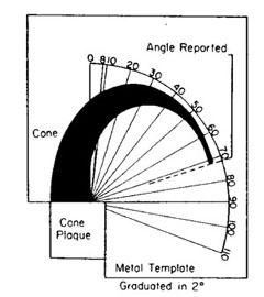 圖4是一個常用的模板,以2°的角度增量來測量測溫錐的變形,在這個圖例中,72°角應(yīng)該為報告經(jīng)過或終點(diǎn)溫度。