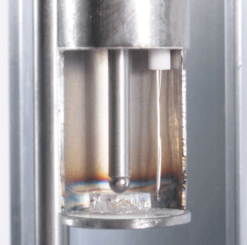 操作:在室溫下,予裁切的玻璃樣品放置在不銹鋼的樣品架上,一層薄薄的剛玉灑在樣品架上,防止玻璃樣品粘結(jié)在樣品架上,直徑為1/8"的不銹鋼球放置在玻璃樣品的上方,探頭棒下降,接觸玻璃樣品。樣品架下降,進(jìn)入室溫爐子,操作者調(diào)節(jié)千分尺,按下“START”按鈕,操作者可以走開做其他的事情,儀器會(huì)做剩下的工作,大約30分鐘后,操作者回到儀器前記錄控制儀顯示器上的軟化點(diǎn)溫度,經(jīng)過(guò)簡(jiǎn)單的校正,便得到近似Littleton軟化點(diǎn)溫度。